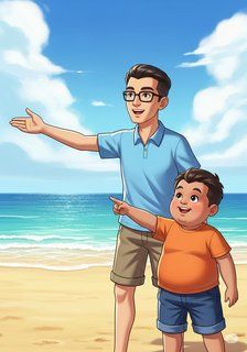 "Mr. Hanif joined the children. "Let's make a sandcastle!" he said. They built a tall sandcastle."