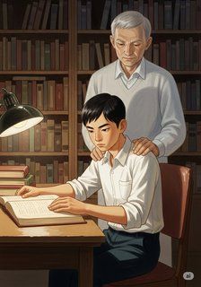 "アキラは書斎で、父の遺した古い書物を前に深く思い悩んでいた。公職者であった父の背中を追い、同じ道を志したが、その道の険しさに心が折れそうになっていた。「父さん…」アキラは無意識に呟いた。"
