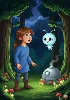 "She followed a faint, shimmering trail until she reached a small clearing. There, nestled among glowing mushrooms, was something she’d never seen before: a small, round spaceship, gently smoking! And next to it, a creature with big, friendly eyes and a shimmering, soft body."